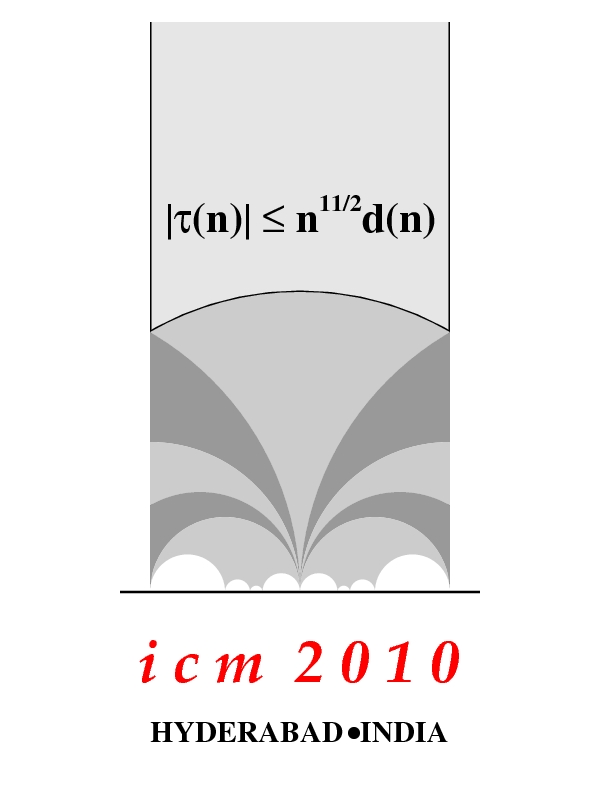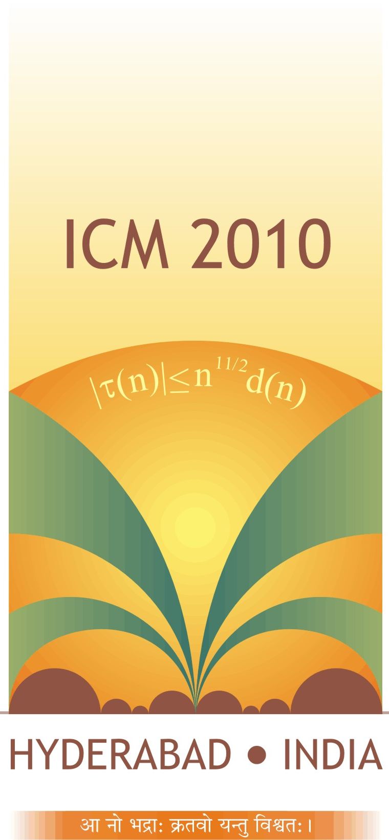 The logo for ICM 2010 depicts the standard fundamental domain for the modular group SL(2,Z) acting on the upper half plane. The formula written along the circular arc is a famous conjecture of the Indian mathematician Srinivasa Ramanujan proved by Pierre Deligne in 1973. The quotation in Sanskrit at the bottom of the logo is from the Rig Veda an ancient Indian religious work dating back to more than 1000 years before the start of the Christian era. It translates as “May good ideas come to us from everywhere.“
